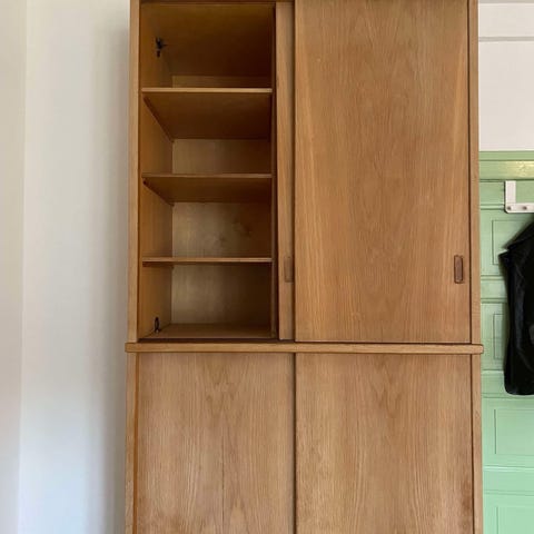 Skabet er velholdt, men gammelt. Det skal formentlig skilles ad og så slæbes op fra en kælder. Vi hjælper gerne med at bære, men du skal selv skille det ad.