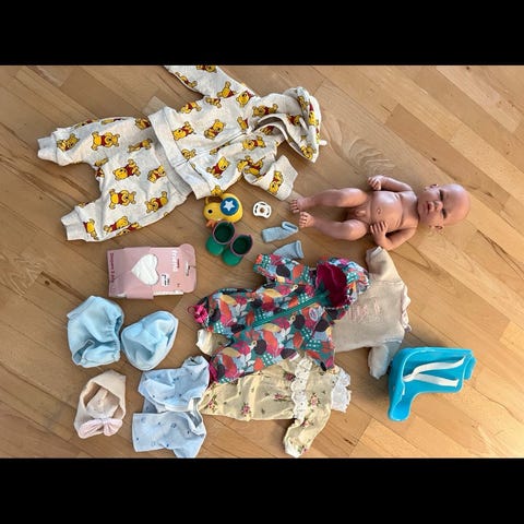 Baby Born dukke med tilbehør. Sættet omfatter en Baby Born dukke iført pink heldragt og hue, en bærepose/vugge i lyserøde nuancer samt en lyserød scooter til dukken. Der medfølger desuden en polstret indsats med bamsemønster, som kan bruges som liggeunderlag til dukken. Velegnet til rolleleg med dukker.