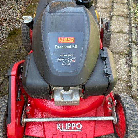 Klippo plæneklipper med benzinmotor. Plæneklipperen har rød klippeenhed og gule håndtag med bredt styr. Modellen er velegnet til klipning af almindelige græsplæner og har fire hjul for stabil kørsel. Motoren er monteret oven på klippehuset, og maskinen betjenes via håndtag med betjeningsgreb til start og fremdrift.