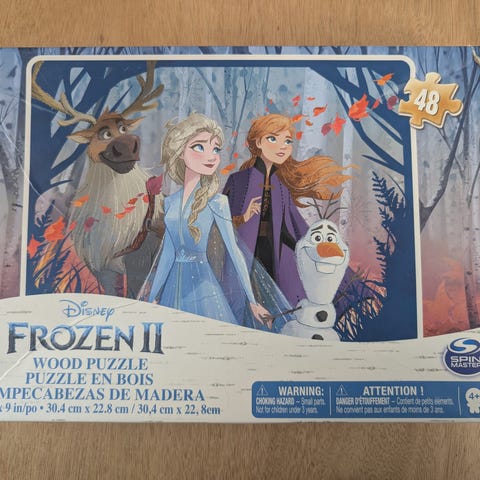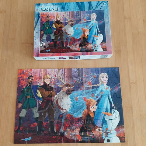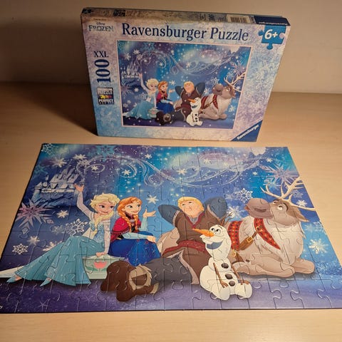 Disney Frozen puslespil med motiv af karaktererne fra filmen. Puslespillet består af 104 brikker og viser blandt andet Anna, Elsa, Olaf og Sven. Velegnet til børn, der kan lide at lægge puslespil med tegnefilmsmotiver.