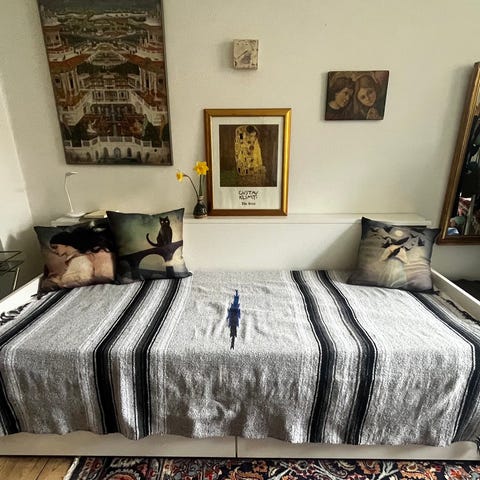 Ilva sovesofa i beige stof. Sofaen kan trækkes ud til sovefunktion, så den fungerer som både sofa og seng. Polstret sæde og ryghynde i samme stof med synlige stikninger. Klassisk model med afrundede armlæn og stofskørt ned mod gulvet. Velegnet til mindre rum, gæsteværelse eller sommerhus, hvor der er behov for en kombination af siddeplads og ekstra soveplads.