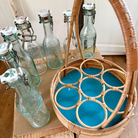 Virkelig sød og velholdt gammel Flaskeholder i bambus/flet. Perfekt på køkkenbordet til olie mm