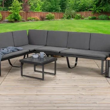 Havesofa loungesæt i grå kunstflet. Består af modulopbygget hjørnesofa samt to borde med glasplade. Sættet er egnet til udendørs brug på terrasse eller altan og giver siddeplads til flere personer. Kunstfletmaterialet er velegnet til udendørs miljøer og kan rengøres med mildt sæbevand.