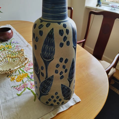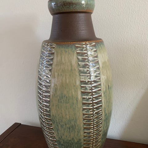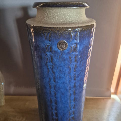Flot stor og fejlfri Søholm gulvvase i flot glasur blå-brun med gyldne rillet mønster