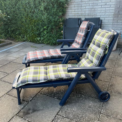 Solvogn liggestol i blå plast med metalstel. Liggefladen består af fleksible plastremme, som er spændt på en ramme af metalrør. Ryglænet kan justeres til siddende eller liggende position. Velegnet til brug i have, på terrasse eller altan som udendørs liggestol.