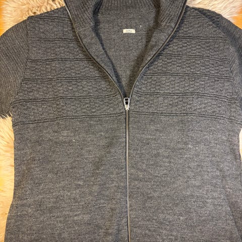 Virkelig dejlig varm næsten ny Cardigan / Lynlåstrøje / Sweater. Farve: Sort / Grå. Materiale: 30% uld og 70% acryl. Har lynlås og knapper forpå + 2 lommer. Mål rundt under ærmerne ca. 112 cm. Længde ca. 70 cm. Indvendig ærmelængde ca. 47 cm. Se alle fotos. Må afhentes i Viborg eller sendes forsikret med DAO + porto. Se gerne mine andre annoncer - mere kan købes med.