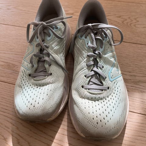 On løbesko i størrelse 41. God til hverdagsbrug og vandring. Modellen er en neutral løbesko med snørelukning og overdel i åndbart mesh i grå og rosa nuancer med sorte detaljer. Skoene har en polstret hælkappe og krave for komfort omkring anklen samt en mellemsål med karakteristiske hulsegmenter, der giver stødabsorbering ved løb. Ydersålen er i gummi med mønster, der giver greb på faste underlag. Velegnet til løb og anden træning.
