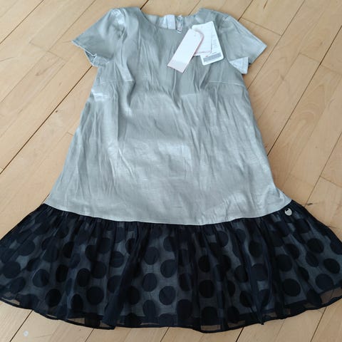 Kjolen er ærmeløs med rund hals og har en markeret talje med pink bælte og pynteblomst foran. Bagpå lukkes den med knapper og har bindebånd i taljen.