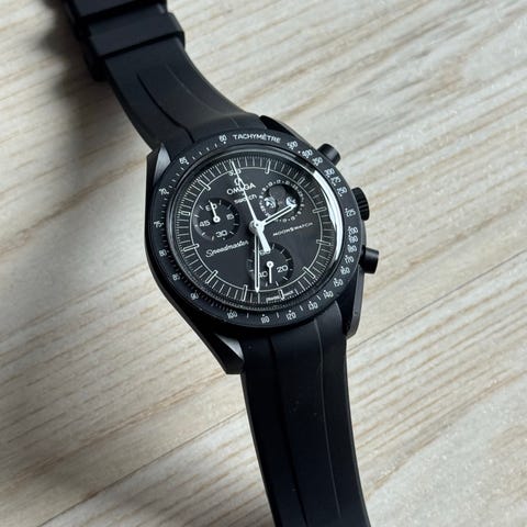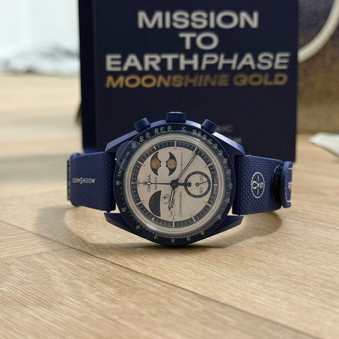 Uret er helt nyt og ubrugt, aldrig båret, og kommer komplet med original emballage og kvittering.MISSION TO EARTHPHASE – MOONSHINE GOLD This chronograph features a navy Bioceramic case, crown, and pushers, paired with a matching navy rubber strap Introducerer oktobers Mission to Earthphase – Moonshine Gold, den tredje kronograf i serien.