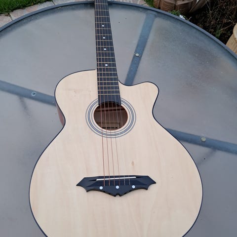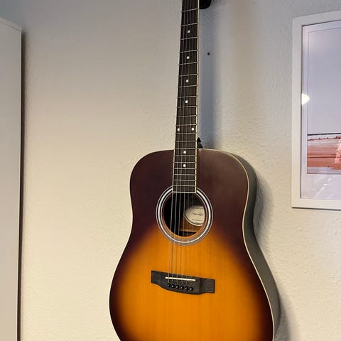 Segovia Session Series SJC-33 akustisk guitar med cutaway-krop i natur træfinish. Velegnet til nybegynder. Der er en repareret skade ved halsfæstet, som ikke ikke har betydning for lyd og spilbarhed.