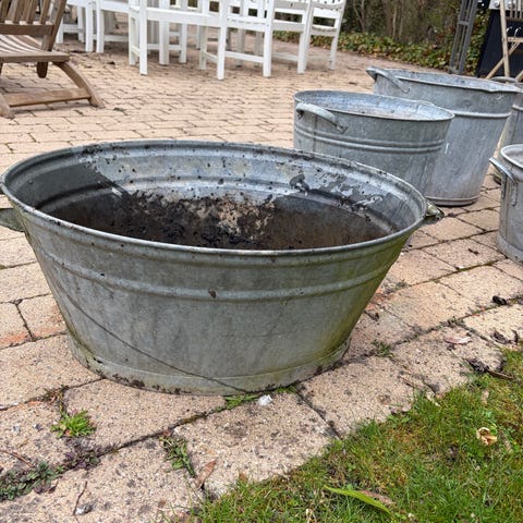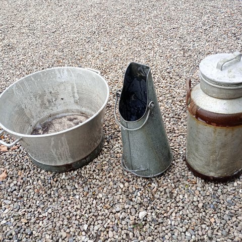 Zink baljer i 3 forskellige størrelser, de 3 kan stables. Mælke spand 40 L.