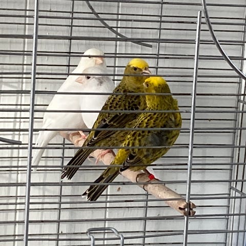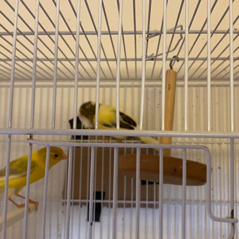 Et par kanariefugle og et stor bur, en brun orange han, en gul hun. buret er ca. 3 måneder gamel.