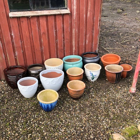 Sæt med blomsterkrukker i terracotta og lys beige. Krukkerne er egnede til udendørs eller indendørs brug på terrasse, altan eller i have. En af krukkerne måler ca. 23 cm i diameter foroven, som vist på billedet. Flere af krukkerne har tilhørende underskåle. Krukkerne har drænhul i bunden til afledning af overskydende vand og kan anvendes til forskellige typer planter og blomster.