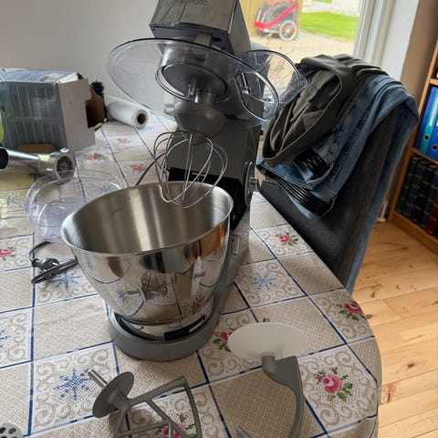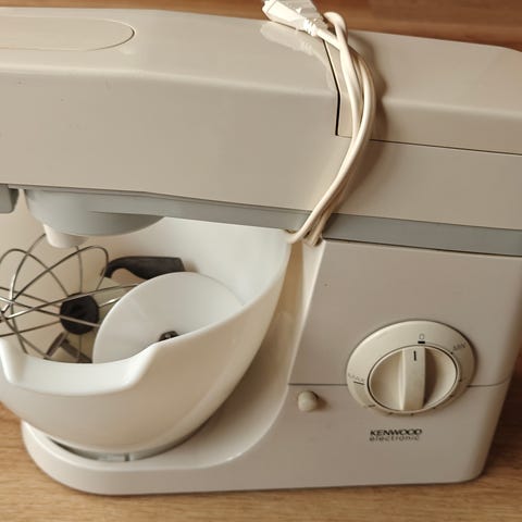 Kenwood køkkenmaskine som køre fejlfrit. Medfølgende tilbehør inkluderer piskeris og fladpisker, som ses på billedet.