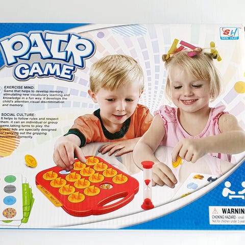 Twinny brætspil for børn. Spillet indeholder kort med farverige illustrationer af figurer og symboler, der bruges til at finde og matche ens motiver.
