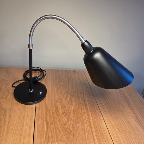 &Tradition Arne Jacobsen bordlampe i sort metal og stål. Lampen har konisk skærm og buet metalarm med rund fod. Velegnet som skrivebordslampe eller læselampe på bord eller kommode. Sort stofledning med afbryder på ledningen. Bruger udskiftelig pære (se mærkat i skærmen for specifikationer).