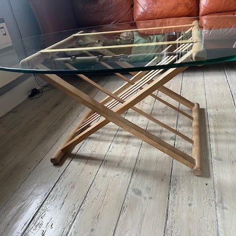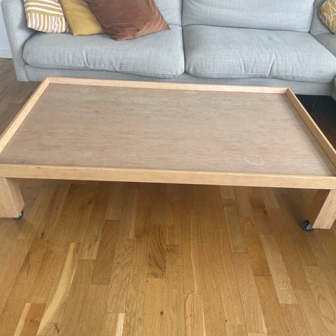 Enkelt og praktisk sofabord i hårdt lyst træ - måske bøgetræ med to glasplader.
