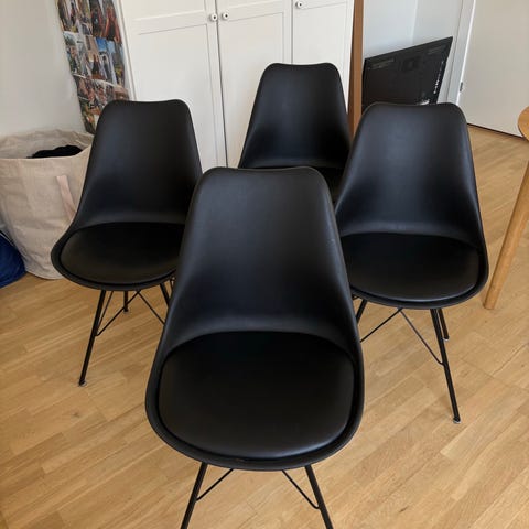 Sælger disse 4 super flotte og velholdte Oslo spisebordsstole i sort. Stolene kombinerer et moderne, nordisk udtryk med rigtig god siddekomfort.
