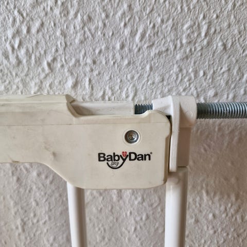 BabyDan sikkerhedsgitter i hvid. Gitteret er beregnet til at afskærme døre eller åbninger for at øge sikkerheden for små børn. Det er udført i et robust materiale med gitterdesign og kan anvendes i hjemmet, f.eks. ved trappeopgange eller døråbninger, hvor der er behov for børnesikring.