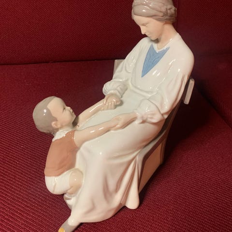 Bing & Grøndahl porcelænsfigur, model med mor der sidder på stol med barn på skødet. Figuren er udført i glaseret porcelæn i lyse farver med blå og beige detaljer. Undersiden har Bing & Grøndahl stempel og modelnummer 1692. Velegnet som dekorativ figur til reol, hylde eller vitrineskab.