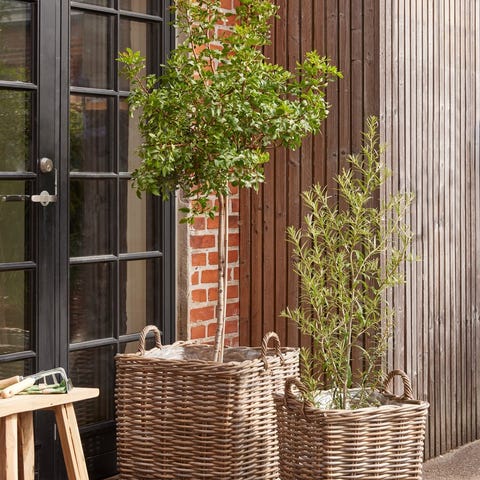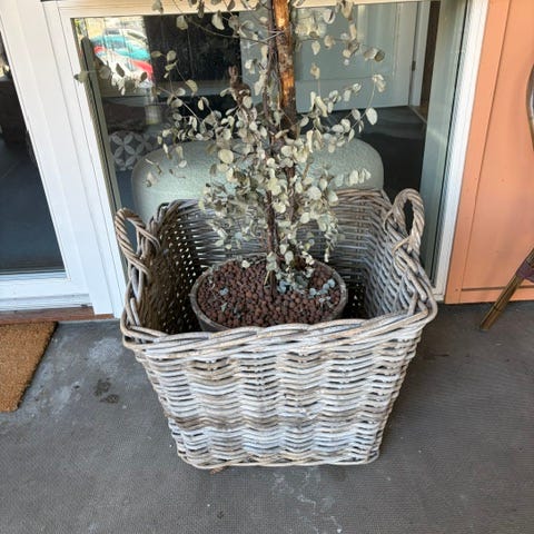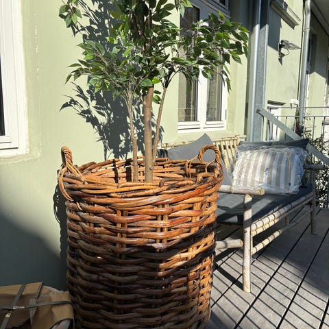 3 små flettede kurve i grå rattan med hank. Kurvene fremstår i tre forskellige størrelser og er egnede til opbevaring eller som plantekurve både inde og ude, afhængigt af behov. Materialet er flettet rattan i en grålig nuance, og hver kurv har bærehank for nem håndtering. Sælges sammen alle 3 små