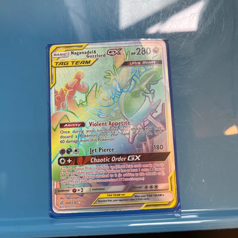 Pokémon Tag Team GX samlekort med motiv af Pikachu & Zekrom. Kortet viser angrebene Full Blitz og Tag Bolt GX samt standard Pokémon bagside. Egnet til samling eller spil i Pokémon Trading Card Game.