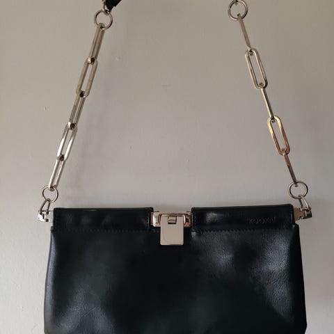 Primark skuldertaske til kvinde i sort kunstlæder med præget krokodillemønster. Tasken har justerbar skulderrem og lukkes med gyldent metalspænde på fronten. Egnet til daglig brug med plads til mindre personlige ejendele som pung, telefon og nøgler.