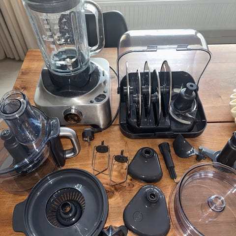 Kenwood køkkenmaskine med tilbehør. Sættet omfatter selve køkkenmaskinen samt flere skåle, kander og forskellige redskaber som piskeris, dejkrog og rørepisker. Der medfølger desuden forskellige skiver og dele til hakning, snitning og blanding. Egnet til madlavning og bagning i hjemmet, hvor der er behov for en multifunktionel køkkenmaskine med flere tilbehørsdele. Flere af delene er ubrugte.