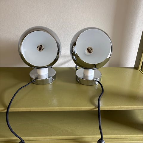 Sengelamper Ball. Ball væglampe, magnetlampe fra Frandsen. Farven er mat hvid. Med 220 cm klar ledning med matchende mellemafbryder og hanstik. Bruger elpære med lille fatning/E14. Fuld funktionsdygtige - ingen buler - med almindelige små brugsspor i lak. Prisen er med monteringsbeslag. Prisen er for begge lamper - enkeltvis 150 kr/stk.