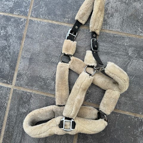 Grime til hest med blød, polstret foring på næsebånd og nakkestykke. Justerbare remme og metalspænder. Farvekombination i sort med lys/creme foring. Velegnet til daglig brug i stald eller fold for at give ekstra komfort omkring trykpunkter på hestens hoved. Size pony