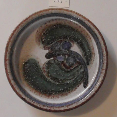 Keramik skål med dekoreret motiv i brune, grønne og mørke nuancer. Skålen har rund form og glaseret overflade. Velegnet som serveringsskål eller som dekorativt element i indretningen.