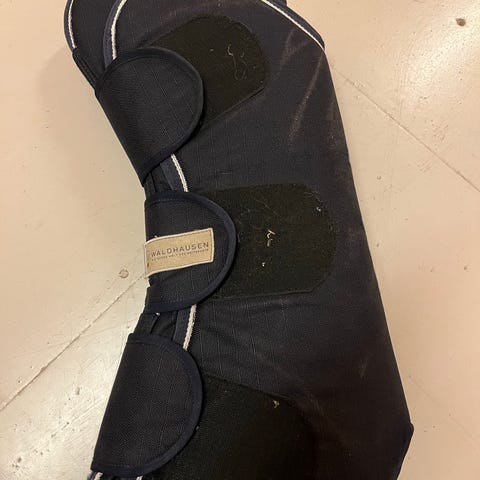 Transportgamacher til for- og bagben. Forbensgamacherne har almindelige brugsspor samt tabt gummi-mærke på øverste velcrostrop (uden betydning). Bagbensgamacher er brugt minimalt og fremstår i flot stand.