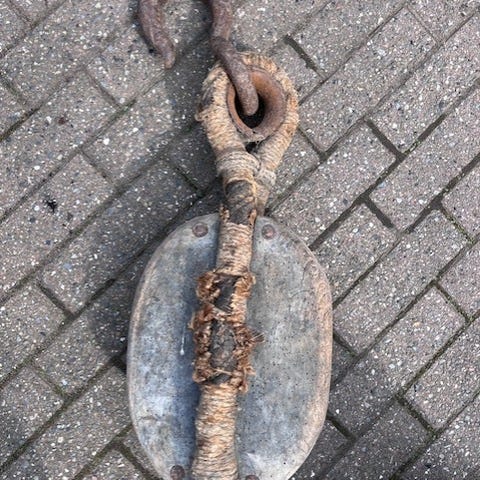 ANTIKVITET: træ-hejse-talje til reb. Gammel talje som har været anvendt til at hejse kornsække på 50 kg. eller 100 kg. 4-5 meter op. Der kræves en "underdel" med hjul og en krog for at taljen kan anvendes.