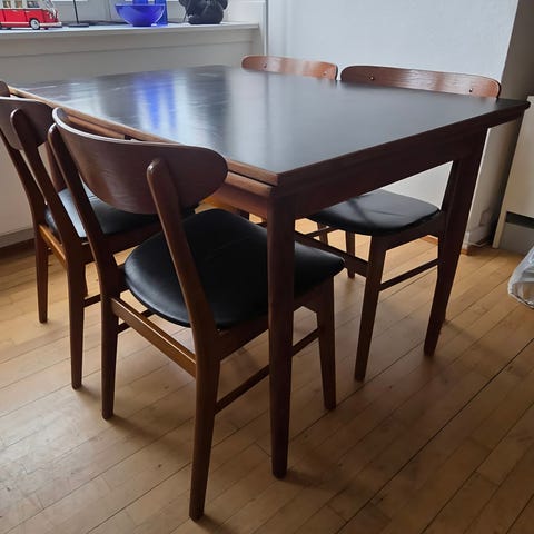 Du får også 4 stole med oveni hatten. Sædet er løst på den ene, og læderbetrækket kunne godt trænge til en kærlig hånd, men de er gode at sidde i, og så er det også billigt.