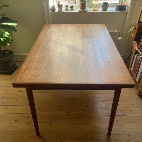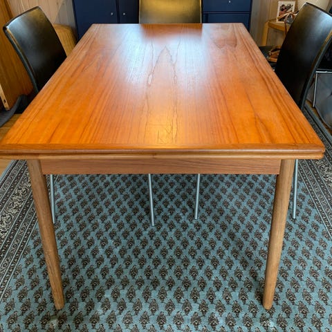 Klassisk spisebord i teak med hollandsk udtræk. Perfekt til lejligheden uden alt for meget plads, men hvor du gerne vil kunne gøre plads til gæster. Vi har klemt os sammen 12 mennesker til nytår, så der er bordplads for pengene! Kunne godt trænge til en slibning. Jeg har gjort det før, og det fjernede alle lignende pletter.