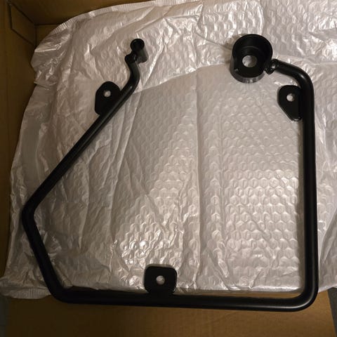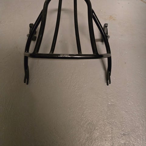 Bagagebærer til mototcykel i sort metal. Modellen monteres bag på motorcyklen og har en fast monteringsplade med forborede huller til fastgørelse. Der medfølger skruer og beslag til montering, som ses i plastposen på billederne. Velegnet som ekstra bagagebærer eller reservedel til motorcykel, hvor der ønskes en stabil bagagebærer i metal.