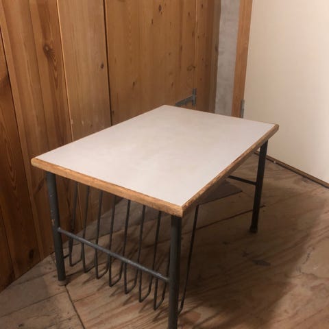 Sidebord / sengebord af sortlakeret metal og messing. Løs top af fineret teak.