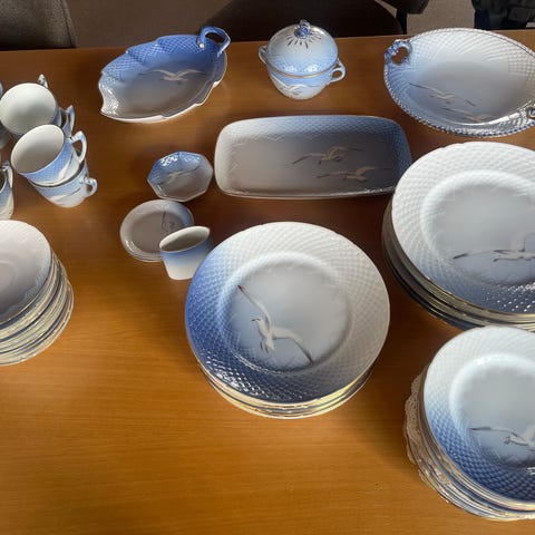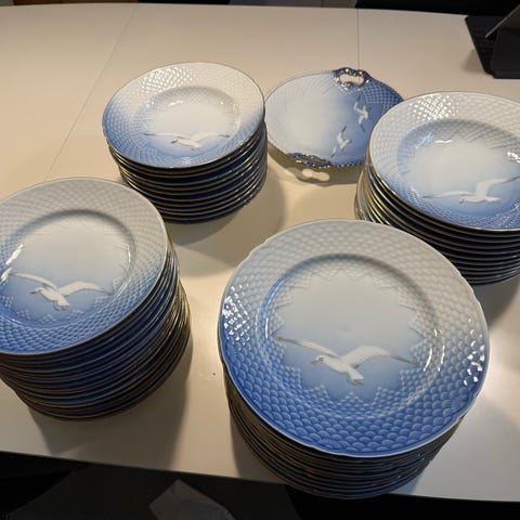 Bing & Grøndahl Måge-stel med guldkant med mange dele. Jeg har: