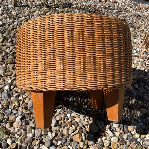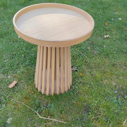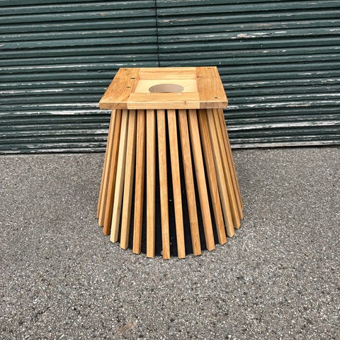 Ukendt mærke rundt sidebord i træ i brun træ. Bordet er cylinderformet med lodrette træstave langs siden og en bordplade sammensat af små træklodser i mønster. Egnet som lille sofabord, sengebord eller ekstra afsætningsplads i stue eller soveværelse. Oprindelig pris ca. 1.300.
