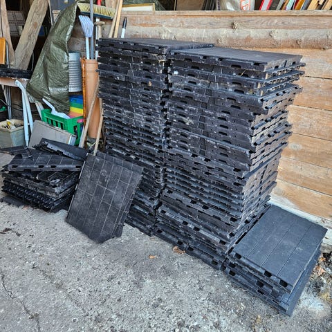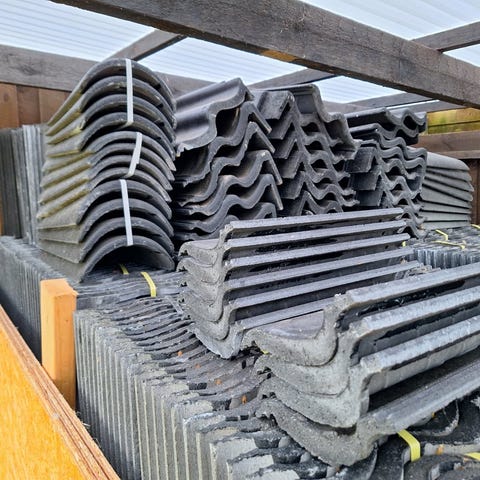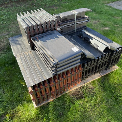 Tagsten med bølgeprofil i grå farve. Egnet til tagdækning eller reparation af eksisterende tag med tilsvarende profil. Leveres i et større parti, som på billederne, og kan anvendes til fx udhuse, garager eller andre bygninger med samme type tagsten.