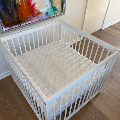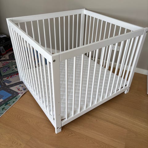 Kravlegård, kan indstilles til tre niveauer. Se også seng med puslebord.
