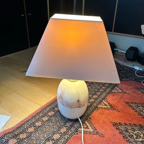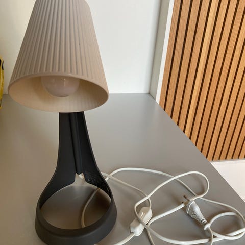 bordlampe. Lampen har en rund, glaseret keramisk fod i lys farve og en konisk brun lampeskærm i tekstil. Leveres med ledning med afbryder og stik til almindelig stikkontakt. Velegnet som belysning på bord, reol eller sengebord. Pæretype og effekt afhænger af den monterede fatning og pære (ikke nærmere angivet).