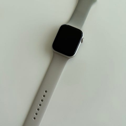 Apple Watch Series 7 smartwatch med 41mm urkasse i farven midnight og urkasse i aluminium. På billederne ses flere udskiftelige remme, herunder sport-remme og en metalmesh-rem, samt den originale oplader. Uret er egnet til brug med iPhone og kan anvendes til aktivitetsmåling, notifikationer, tidsvisning og andre smartwatch-funktioner, som understøttes af Apple Watch Series 7-modellen.