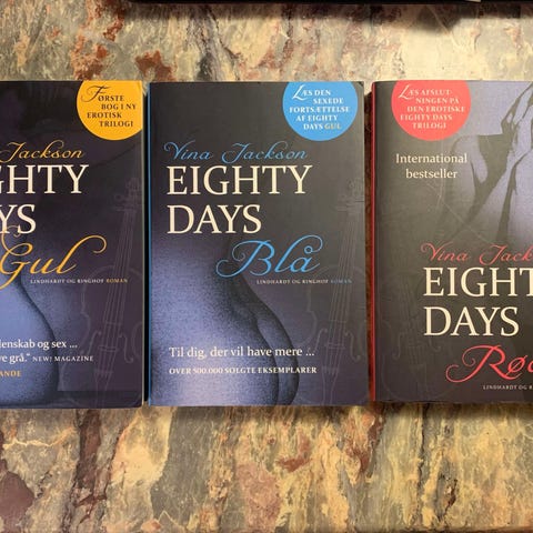 Eighty Days -. Gul, Blå, Rød, Vina Jackson, genre: romantik, 3 Hæftet udgaver fra 2013 i perfekt stand, helt nye bøger. Dette er alle 3 bøger i serien.