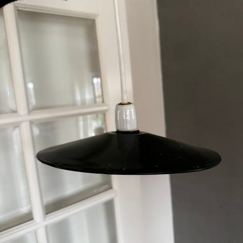 Konverteret til E27. H. ca. 49 Ø 44 cm. Fremstår med enkelte brugsspor (patina), herunder emaljeafslag.