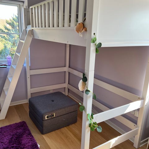 Manis-H høj seng i hvid m. integreret stige i venstre side. Sengen måler 90x190cm. Madras medfølger.