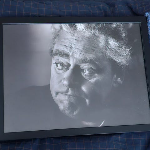 Stort sort hvidt foto , af Danmarks to største kunstnere sammen , Kim Larsen & Dirch Passer tryk på lærred, & isat ramme. 30 x 40 Cm. Foto fra 1980.