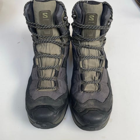 Hoka vandrestøvler i grå og blå farve i størrelse 38 Støvlerne er ankelhøje med snørelukning og polstret skaft for ekstra komfort. Overdelen er i syntetisk materiale og tekstil med forstærkninger ved snude og hæl. Ydersålen er kraftig med mønster, der giver godt fodfæste på forskellige underlag. Velegnet til vandring og udendørsaktiviteter.