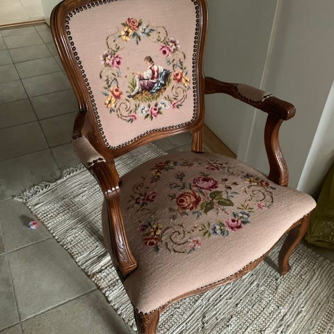 2 smukke matchende salonstole med håndbroderet betræk – unikke