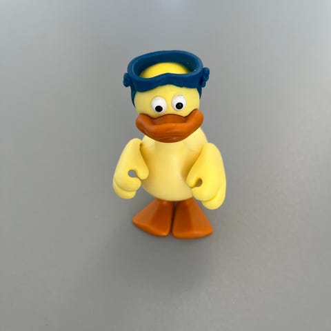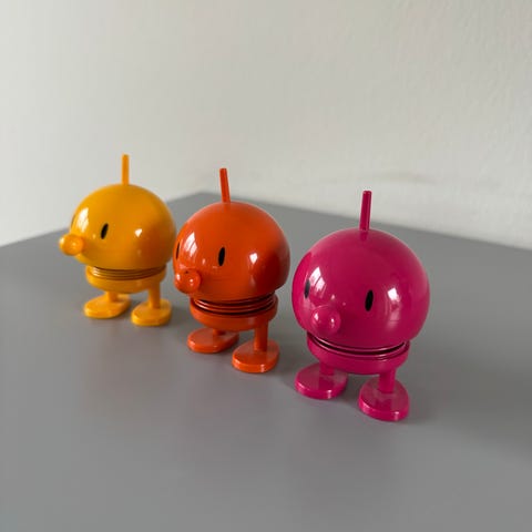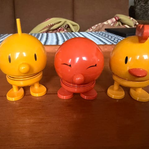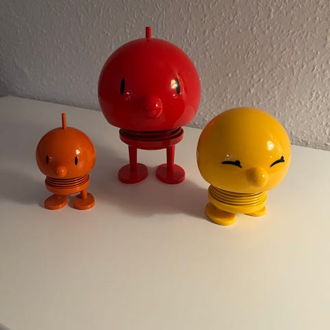 Hoptimist figur formet som en lille kylling i gul plastik med orange næb og kam. Figuren står på to fødder og har fjeder i kroppen, så den bevæger sig ved berøring. Velegnet som pynt på bord, hylde eller skrivebord, fx på børneværelse eller kontor.
